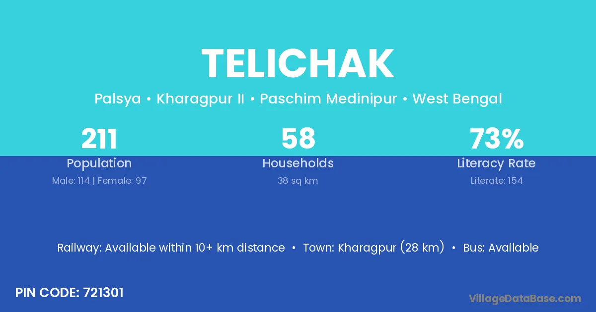 Kharagpur (28 km) is the nearest town to Telichak village for major economic activities and is located approximately 28 km away.