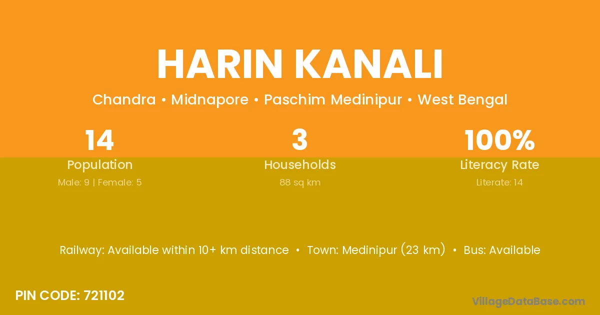 Medinipur (23 km) is the nearest town to Harin Kanali village for major economic activities and is located approximately 23 km away.