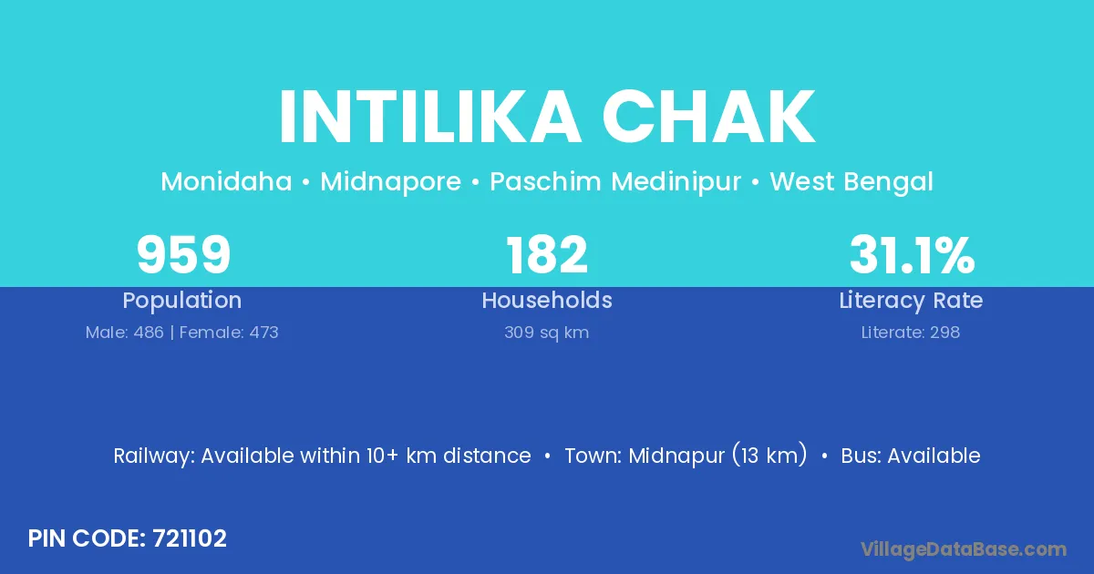 Midnapur (13 km) is the nearest town to Intilika Chak village for major economic activities and is located approximately 13 km away.