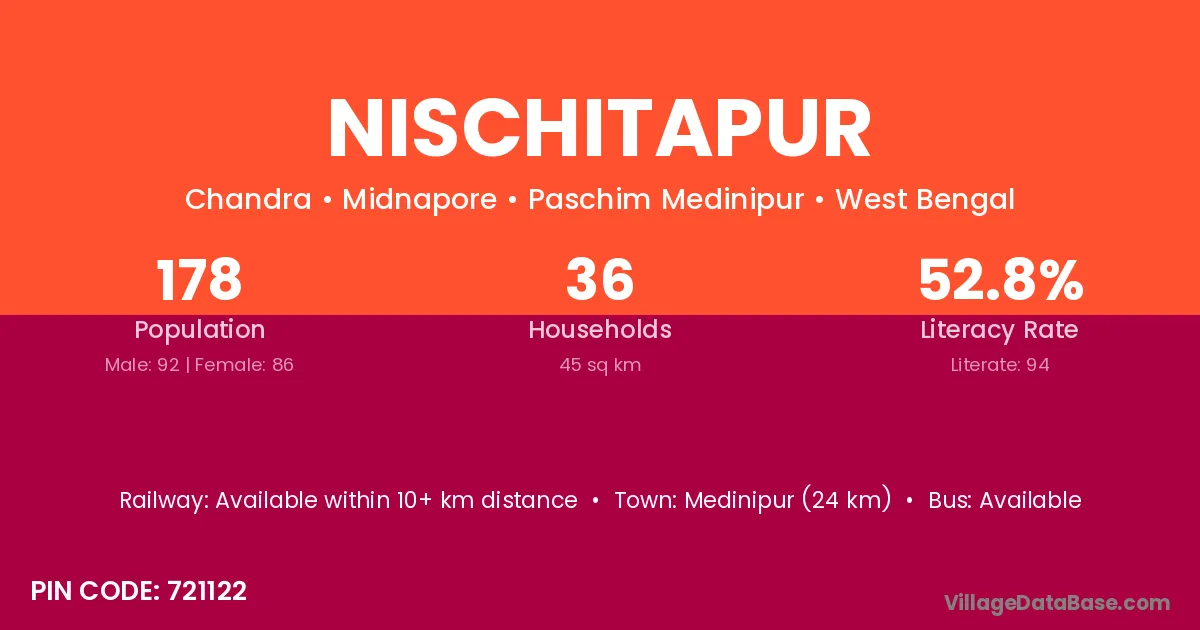 Medinipur (24 km) is the nearest town to Nischitapur village for major economic activities and is located approximately 24 km away.