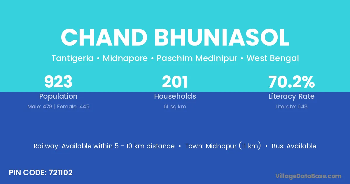 Midnapur (11 km) is the nearest town to Chand Bhuniasol village for major economic activities and is located approximately 11 km away.