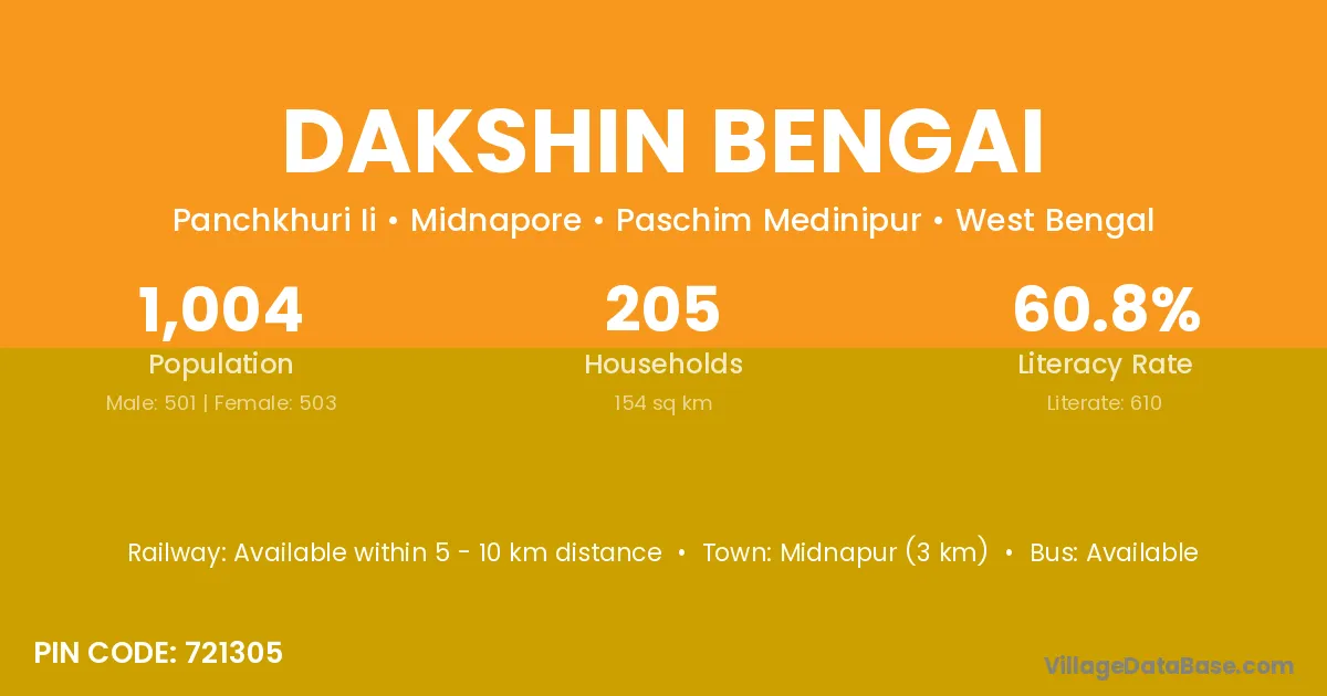 Midnapur (3 km) is the nearest town to Dakshin Bengai village for major economic activities and is located approximately 3 km away.