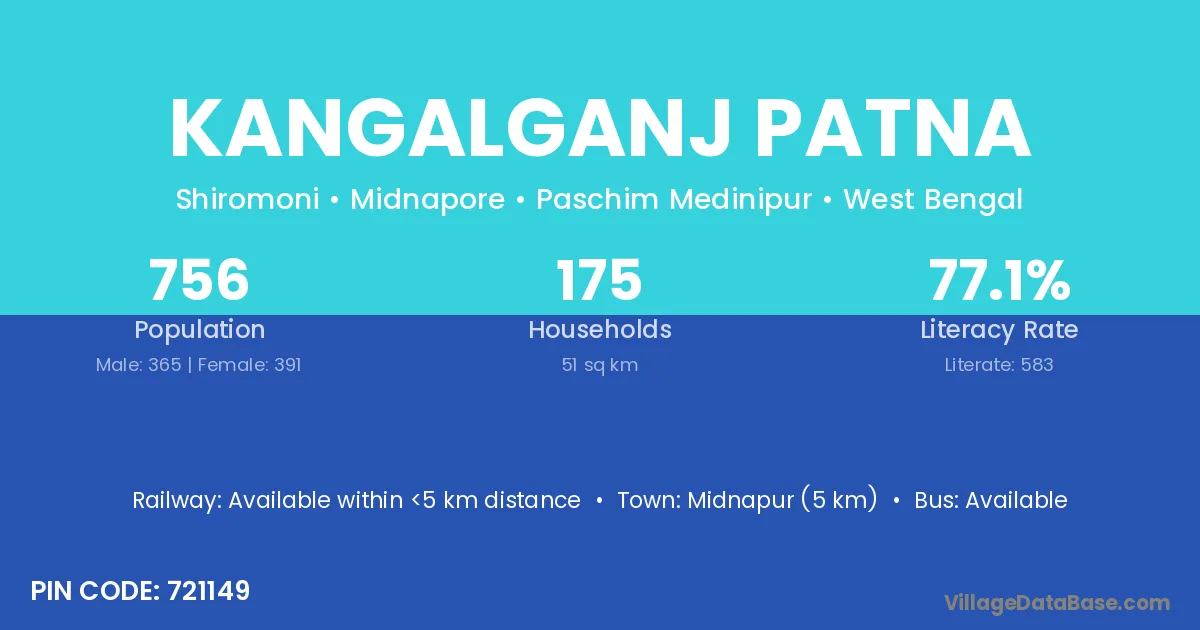 Midnapur (5 km) is the nearest town to Kangalganj Patna village for major economic activities and is located approximately 5 km away.