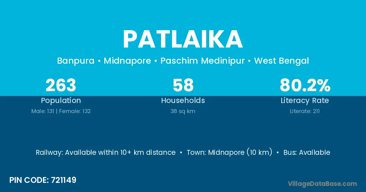 Midnapore (10 km) is the nearest town to Patlaika village for major economic activities and is located approximately 10 km away.