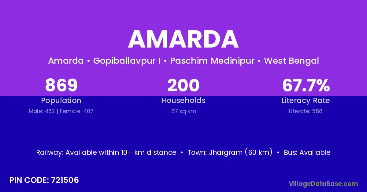 Egra (33 km) is the nearest town to Amarda village for major economic activities and is located approximately 33 km away.