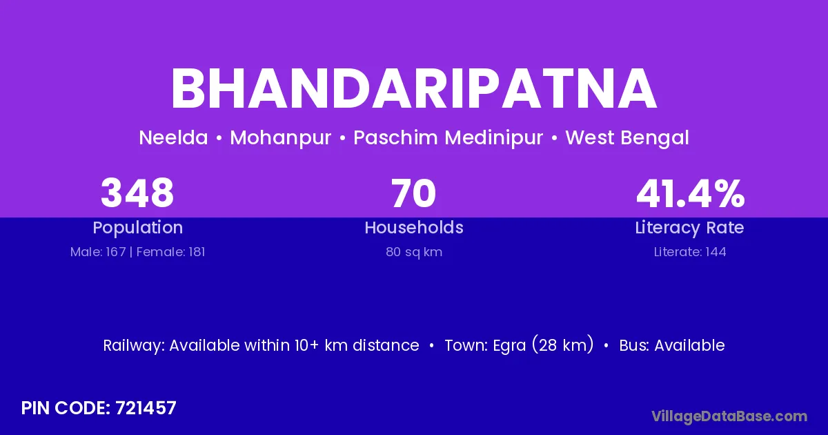 Egra (28 km) is the nearest town to Bhandaripatna village for major economic activities and is located approximately 28 km away.