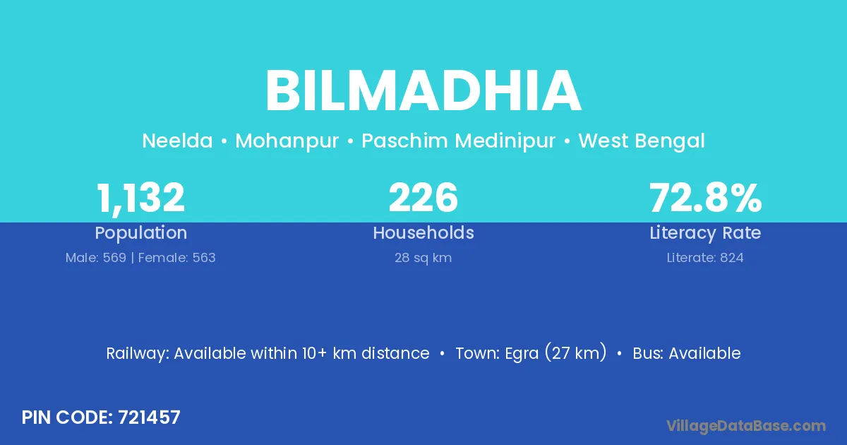 Egra (27 km) is the nearest town to Bilmadhia village for major economic activities and is located approximately 27 km away.