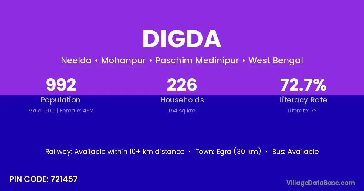 Egra (30 km) is the nearest town to Digda village for major economic activities and is located approximately 30 km away.