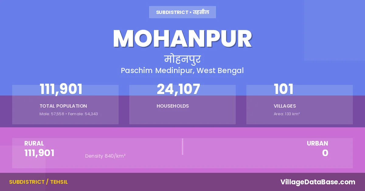 According to the 2011 census The total area of Mohanpur Subdivision is 133 km², with a population of 111901 people. The population density is 840 inhabitants per square kilometre, and there are approximately 24107 houses in the sub district.