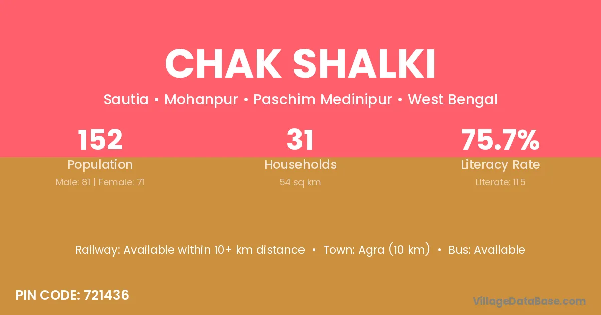 Chak Shalki village is located in the Mohanpur Subdivision of the Paschim Medinipur district in West Bengal.