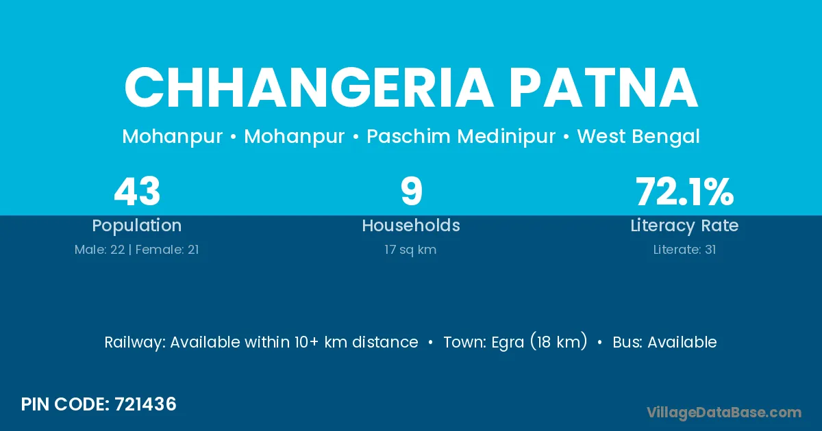 Egra (18 km) is the nearest town to Chhangeria Patna village for major economic activities and is located approximately 18 km away.