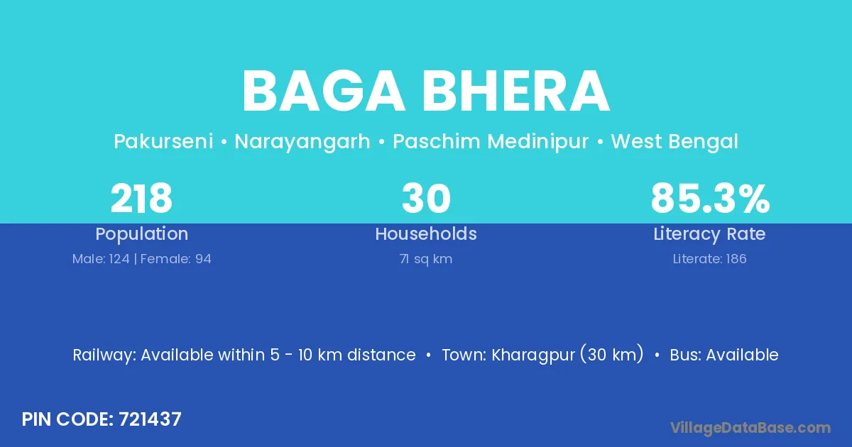 Kharagpur (30 km) is the nearest town to Baga Bhera village for major economic activities and is located approximately 30 km away.