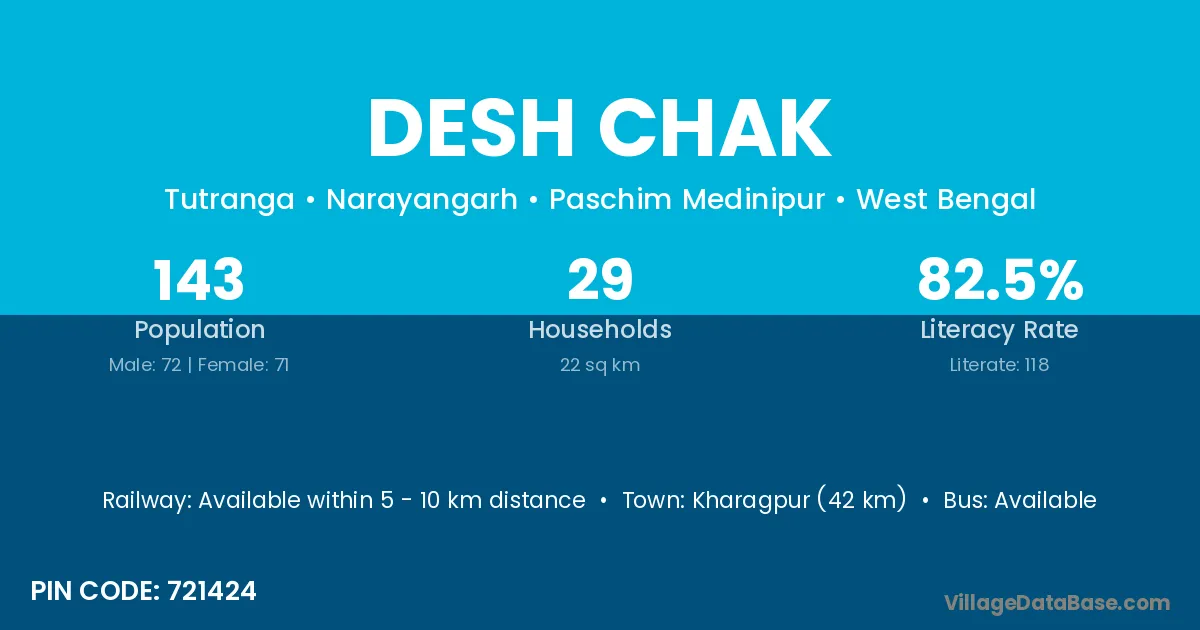 Kharagpur (42 km) is the nearest town to Desh Chak village for major economic activities and is located approximately 42 km away.