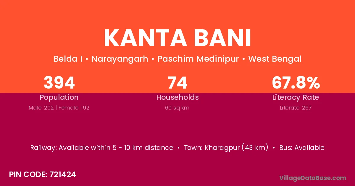 Kharagpur (43 km) is the nearest town to Kanta Bani village for major economic activities and is located approximately 43 km away.