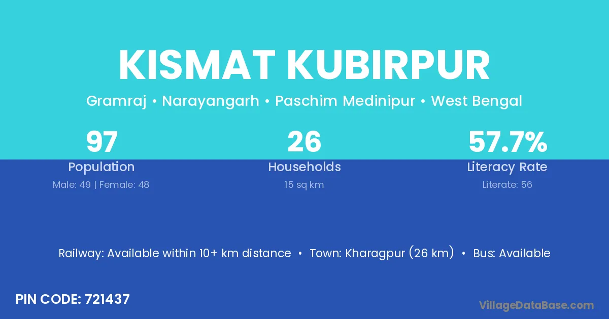 Kharagpur (26 km) is the nearest town to Kismat Kubirpur village for major economic activities and is located approximately 26 km away.