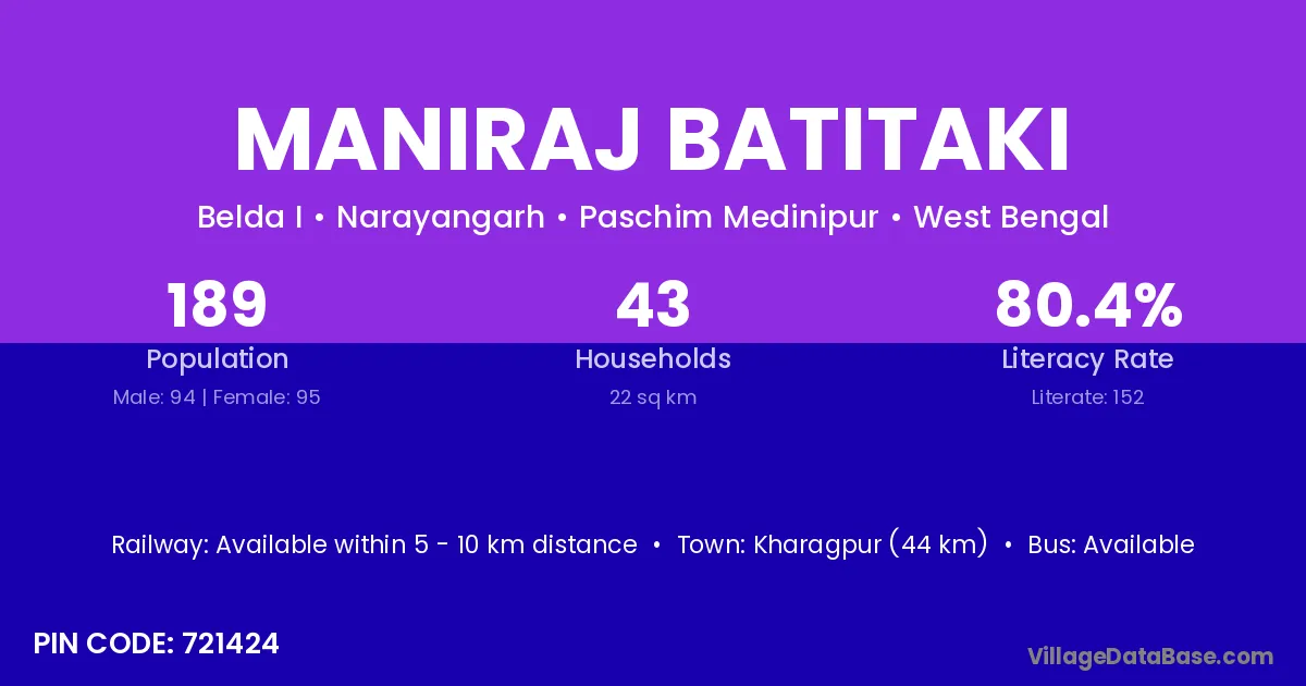 Kharagpur (44 km) is the nearest town to Maniraj Batitaki village for major economic activities and is located approximately 44 km away.