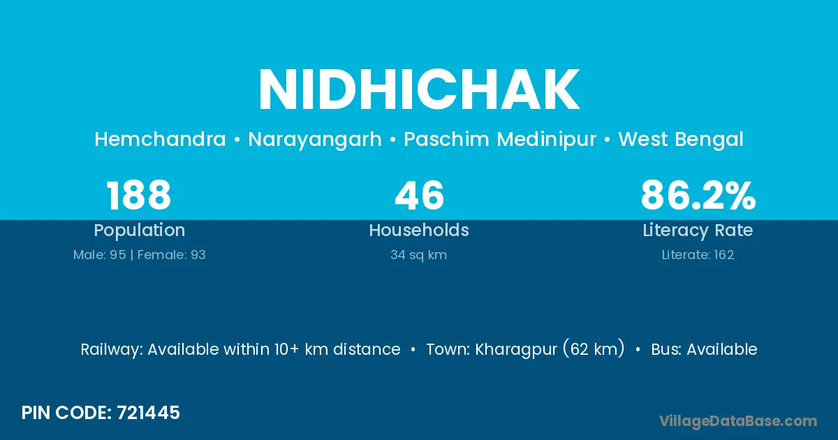 Kharagpur (62 km) is the nearest town to Nidhichak village for major economic activities and is located approximately 62 km away.