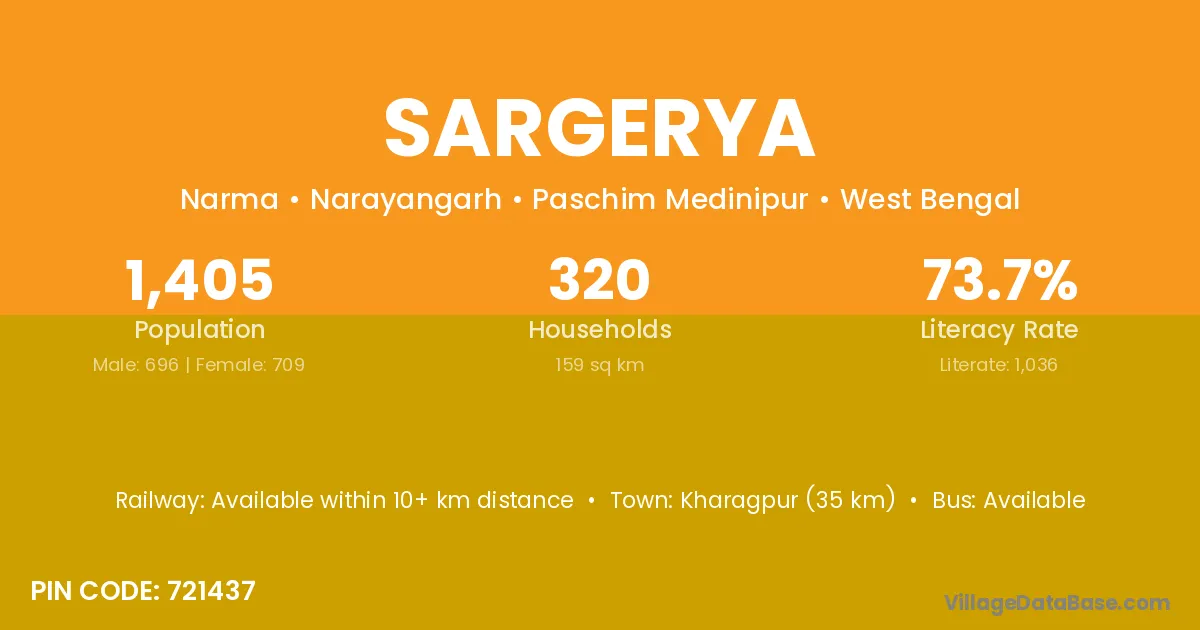 Sargerya village is located in the Narayangarh Subdivision of the Paschim Medinipur district in West Bengal.
