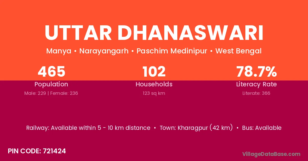 Kharagpur (42 km) is the nearest town to Uttar Dhanaswari village for major economic activities and is located approximately 42 km away.
