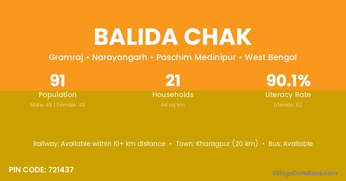 Kharagpur (20 km) is the nearest town to Balida Chak village for major economic activities and is located approximately 20 km away.