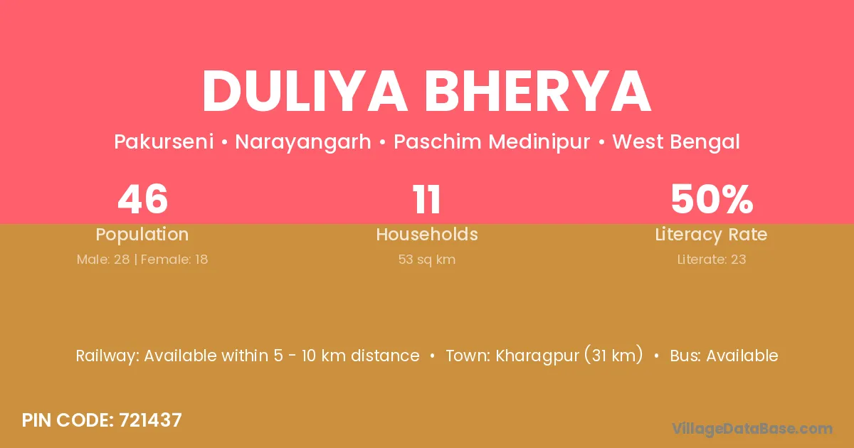 Kharagpur (31 km) is the nearest town to Duliya Bherya village for major economic activities and is located approximately 31 km away.