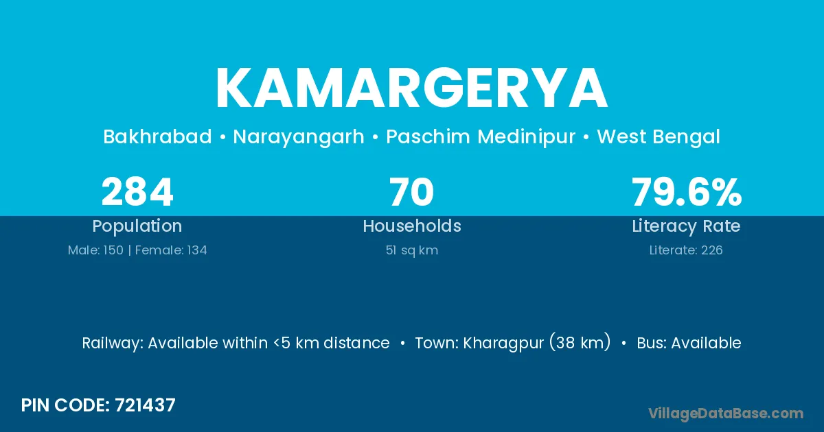 Kharagpur (38 km) is the nearest town to Kamargerya village for major economic activities and is located approximately 38 km away.