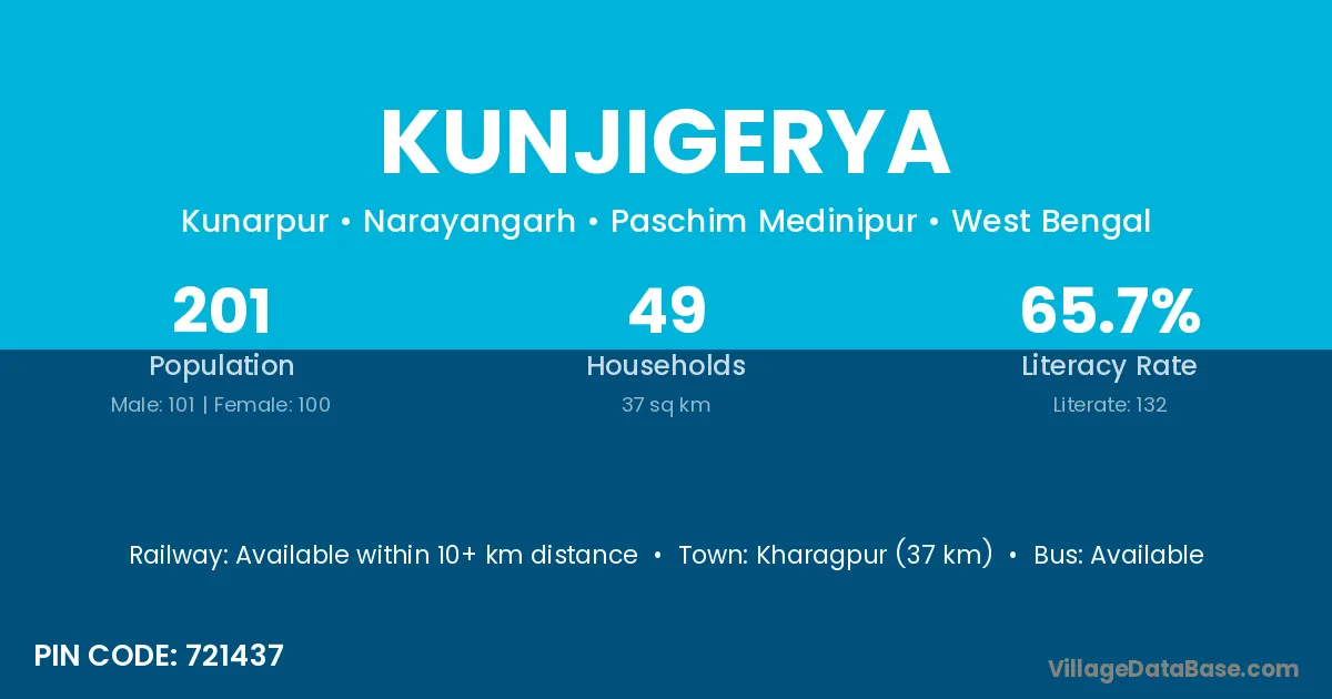 Kharagpur (37 km) is the nearest town to Kunjigerya village for major economic activities and is located approximately 37 km away.