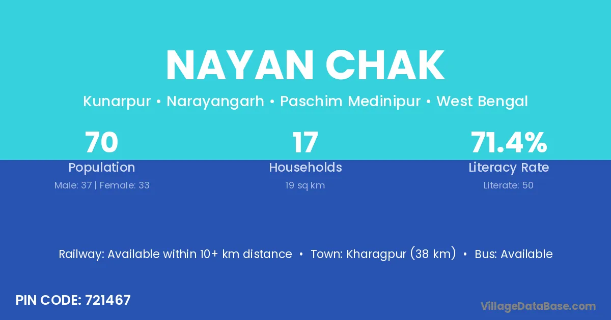 Kharagpur (38 km) is the nearest town to Nayan Chak village for major economic activities and is located approximately 38 km away.