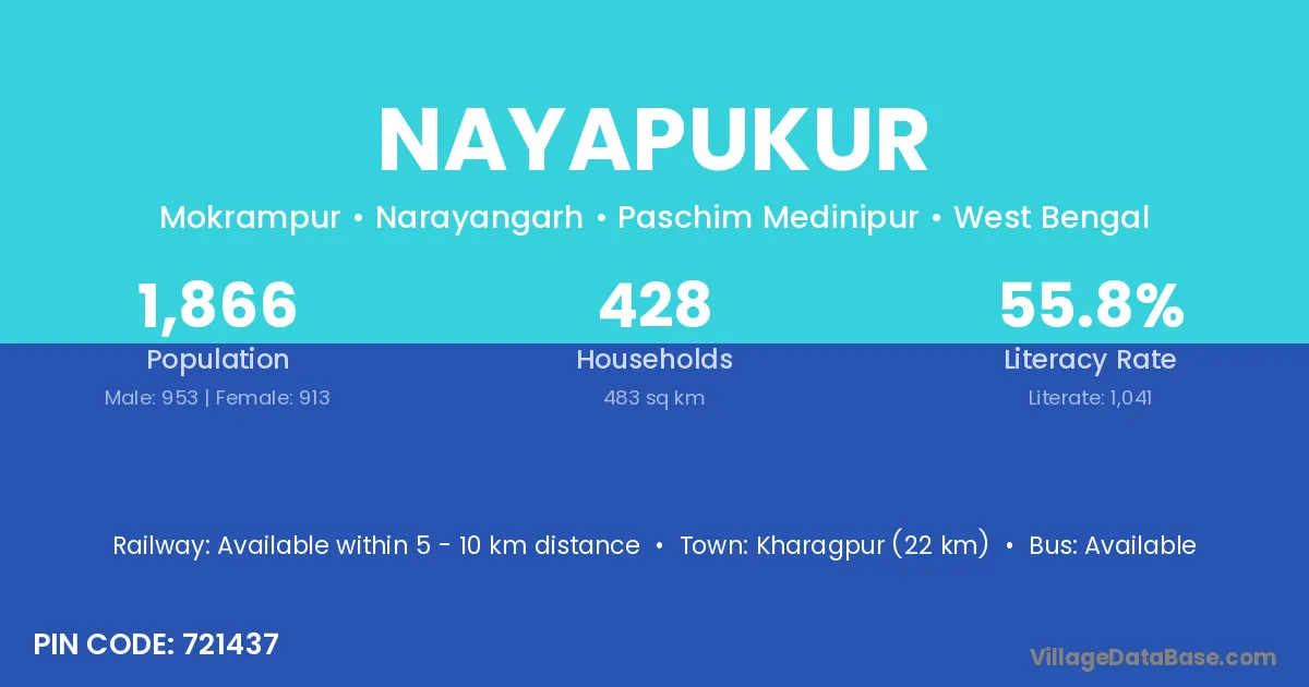 Kharagpur (22 km) is the nearest town to Nayapukur village for major economic activities and is located approximately 22 km away.