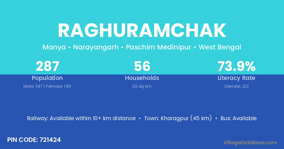 Kharagpur (45 km) is the nearest town to Raghuramchak village for major economic activities and is located approximately 45 km away.