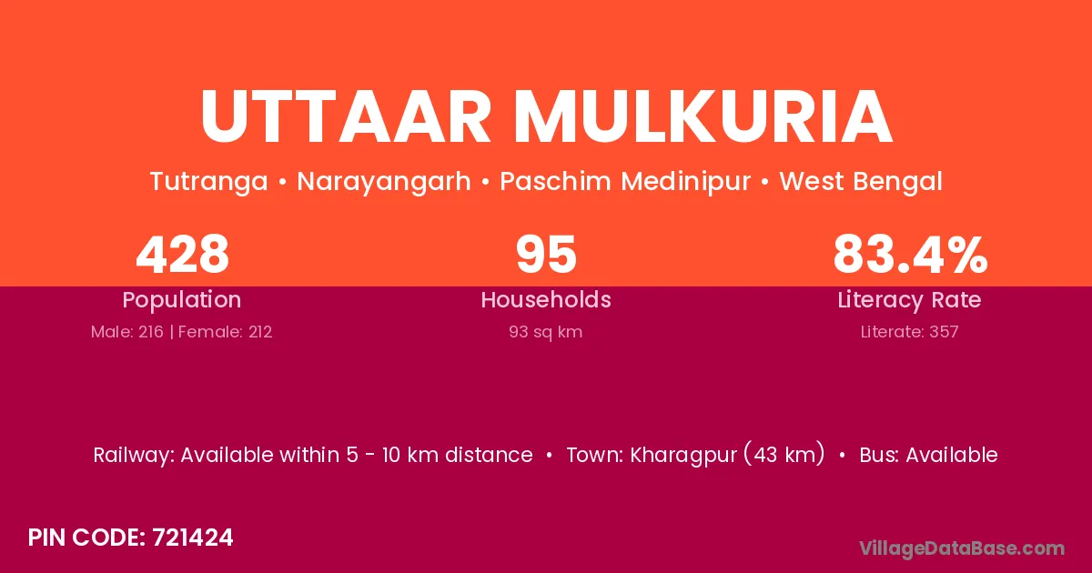 Kharagpur (43 km) is the nearest town to Uttaar Mulkuria village for major economic activities and is located approximately 43 km away.