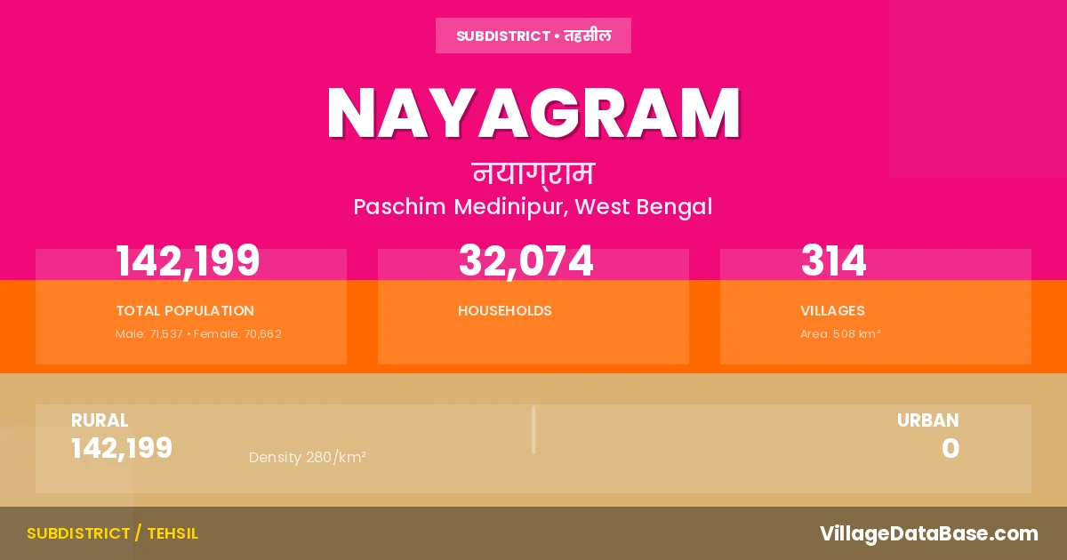 According to the 2011 census The total area of Nayagram Subdivision is 508 km², with a population of 142199 people. The population density is 280 inhabitants per square kilometre, and there are approximately 32074 houses in the sub district.