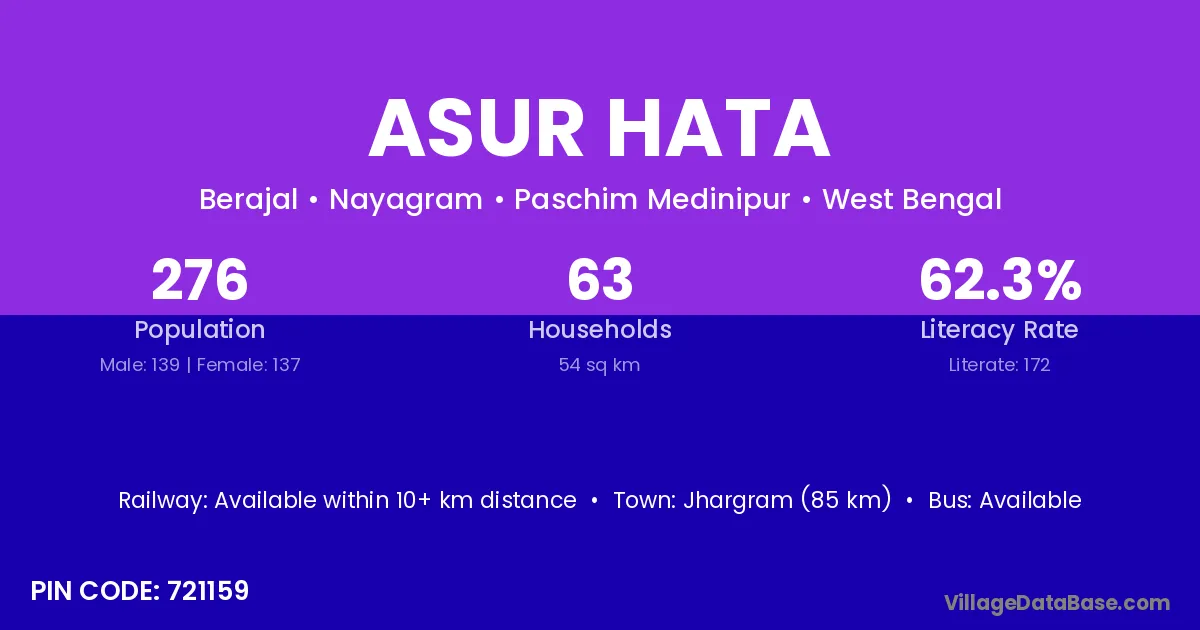 Jhargram (85 km) is the nearest town to Asur Hata village for major economic activities and is located approximately 85 km away.