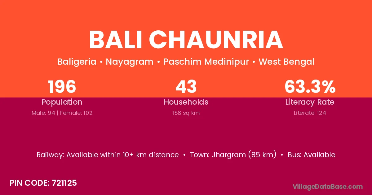 Jhargram (85 km) is the nearest town to Bali Chaunria village for major economic activities and is located approximately 85 km away.