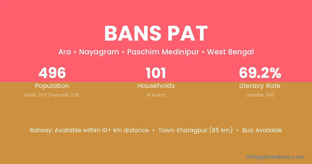 Kharagpur (85 km) is the nearest town to Bans Pat village for major economic activities and is located approximately 85 km away.