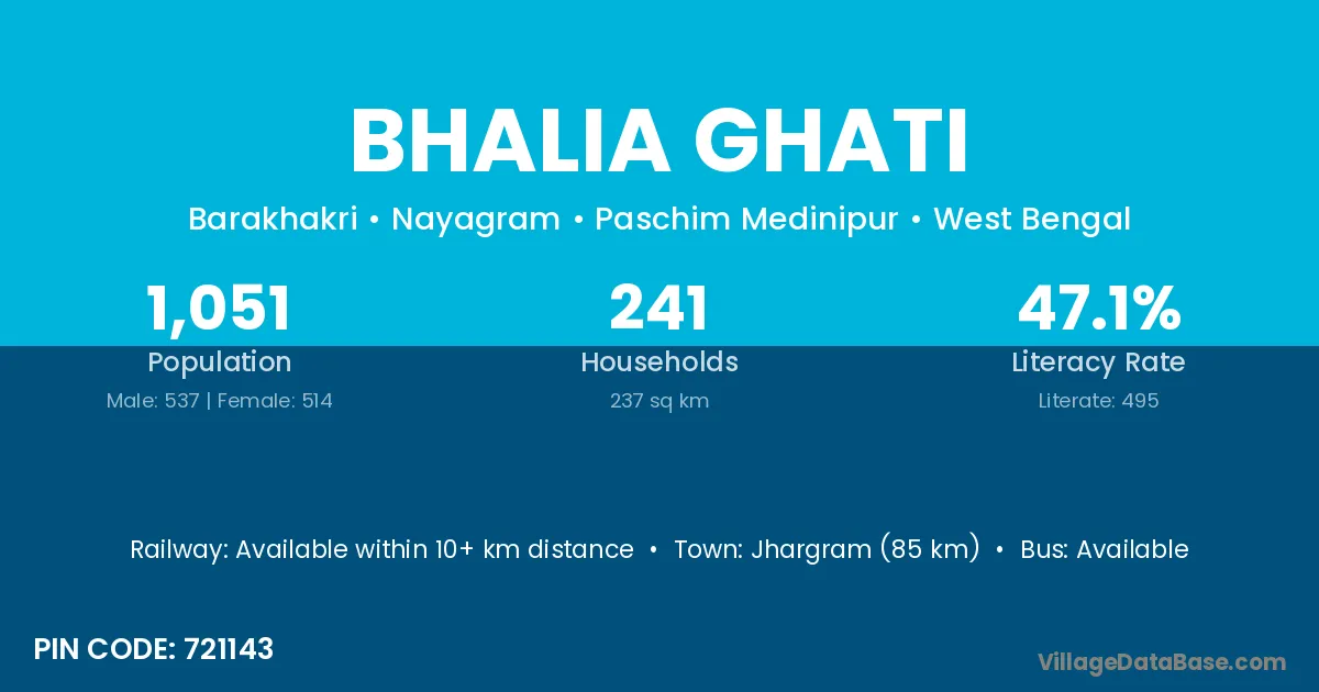 Jhargram (85 km) is the nearest town to Bhalia Ghati village for major economic activities and is located approximately 85 km away.