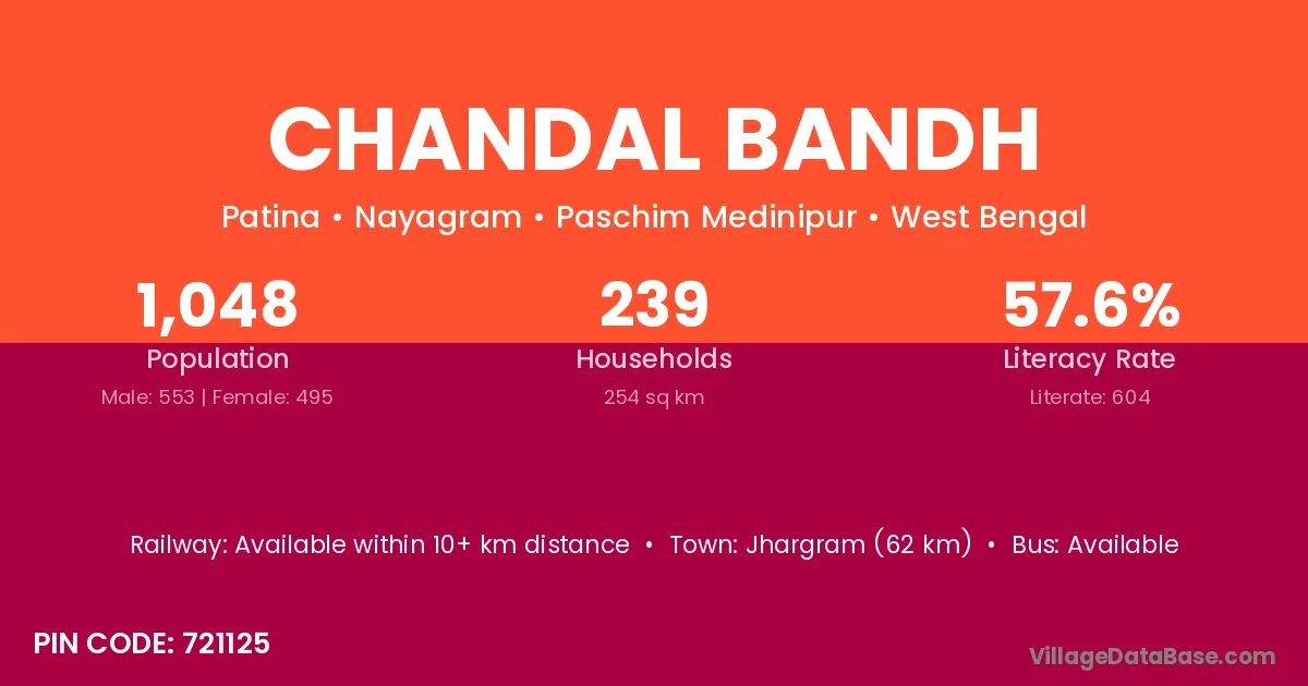 Jhargram (62 km) is the nearest town to Chandal Bandh village for major economic activities and is located approximately 62 km away.