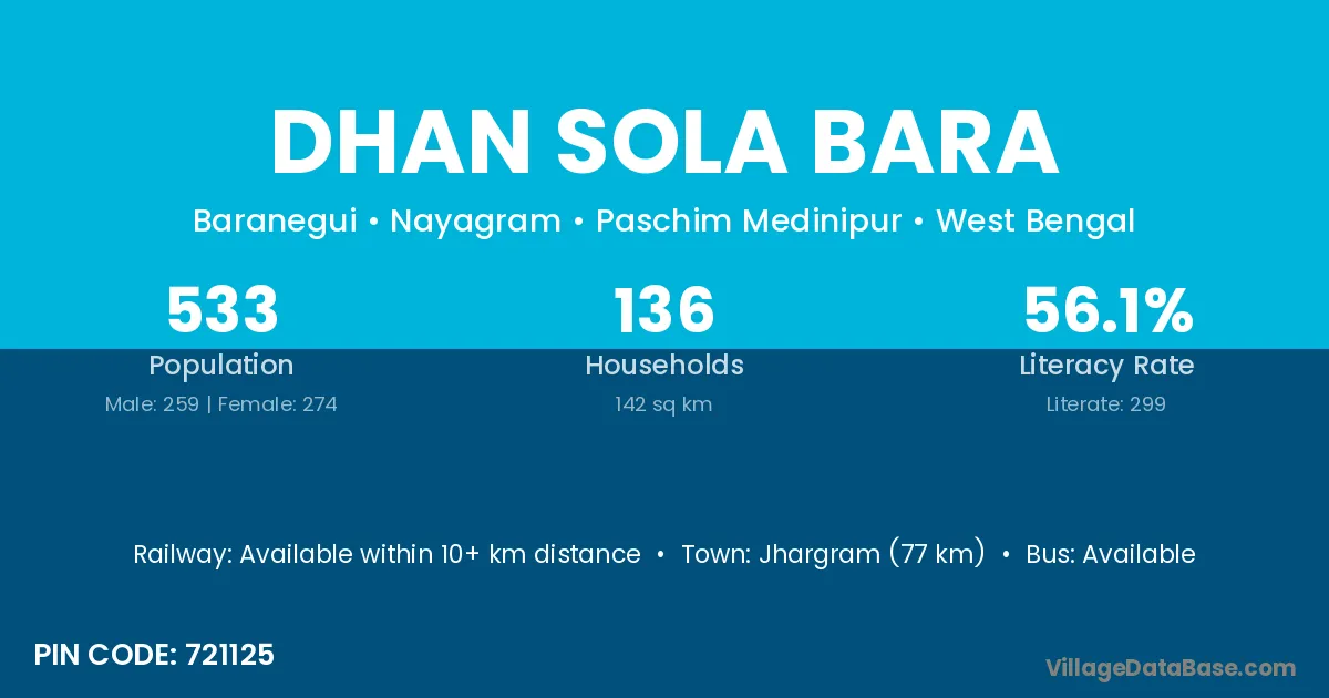 Jhargram (77 km) is the nearest town to Dhan Sola Bara village for major economic activities and is located approximately 77 km away.
