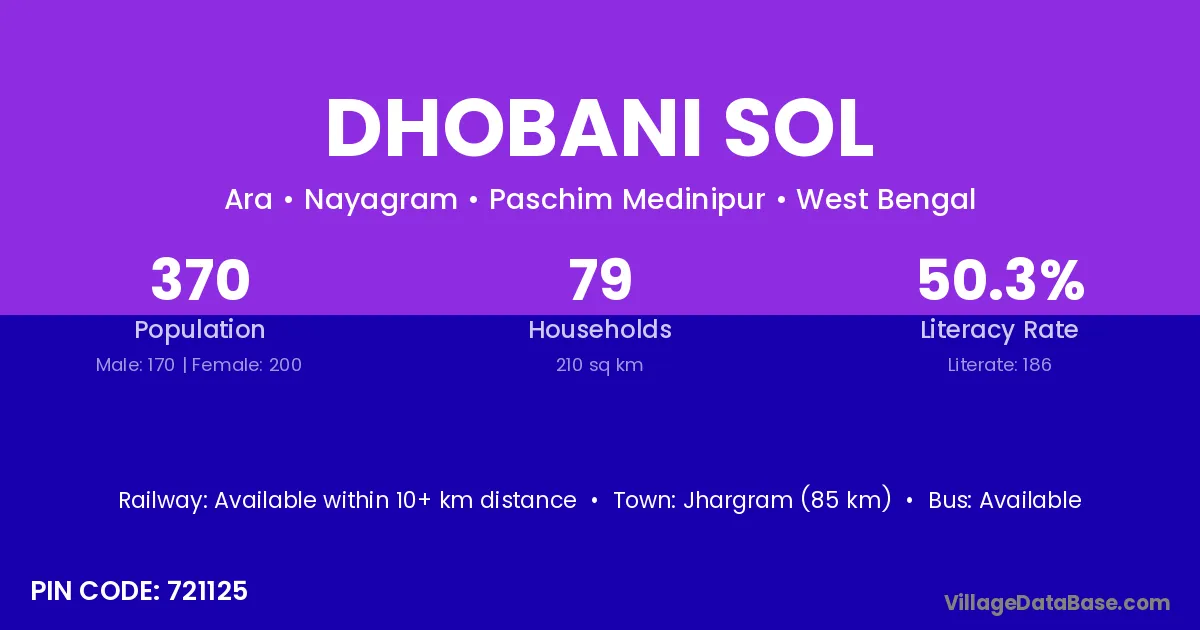 Jhargram (85 km) is the nearest town to Dhobani Sol village for major economic activities and is located approximately 85 km away.