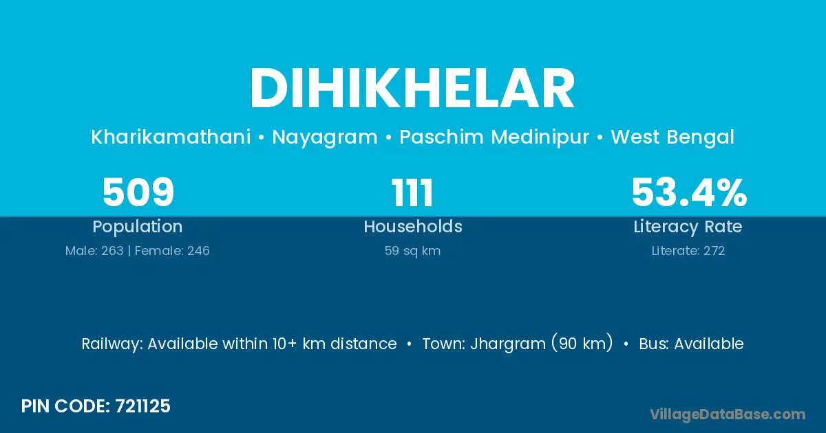 Jhargram (90 km) is the nearest town to Dihikhelar village for major economic activities and is located approximately 90 km away.