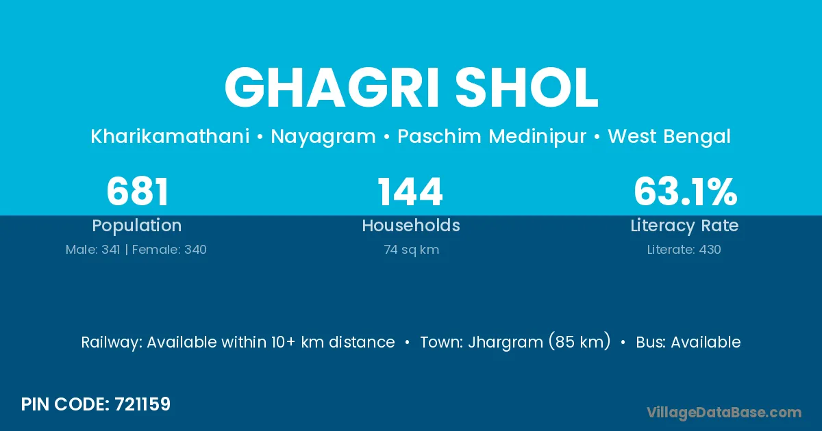 Jhargram (85 km) is the nearest town to Ghagri Shol village for major economic activities and is located approximately 85 km away.