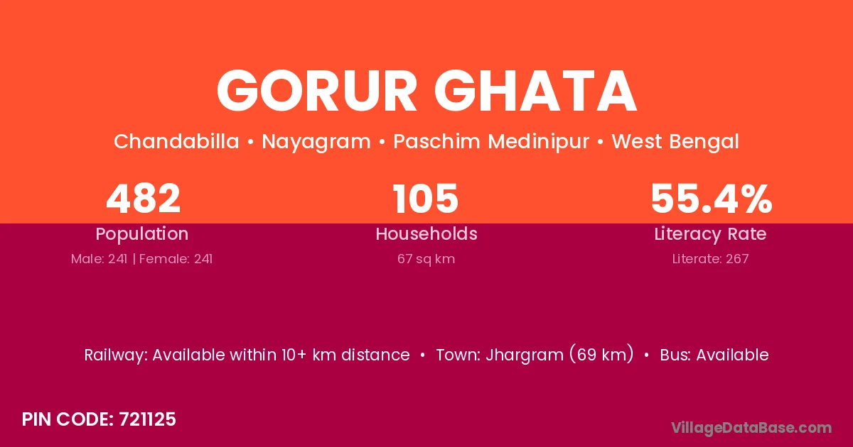 Jhargram (69 km) is the nearest town to Gorur Ghata village for major economic activities and is located approximately 69 km away.