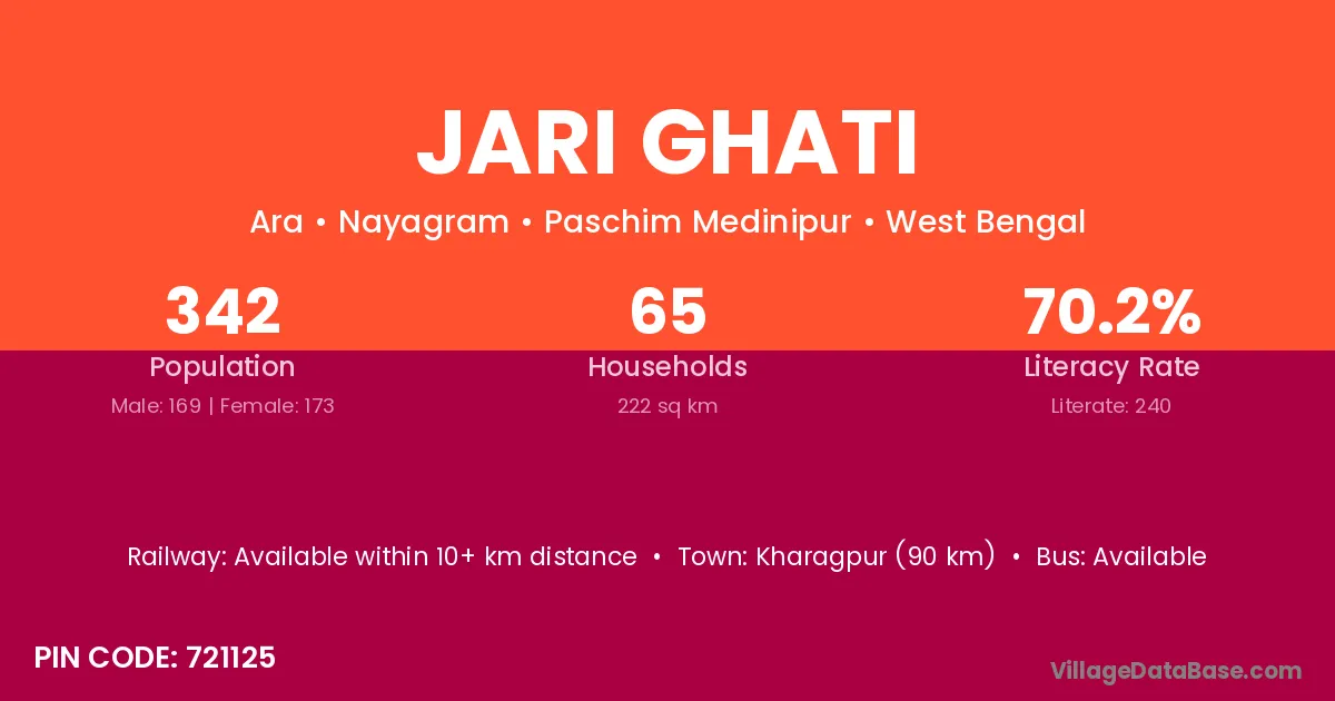 Kharagpur (90 km) is the nearest town to Jari Ghati village for major economic activities and is located approximately 90 km away.