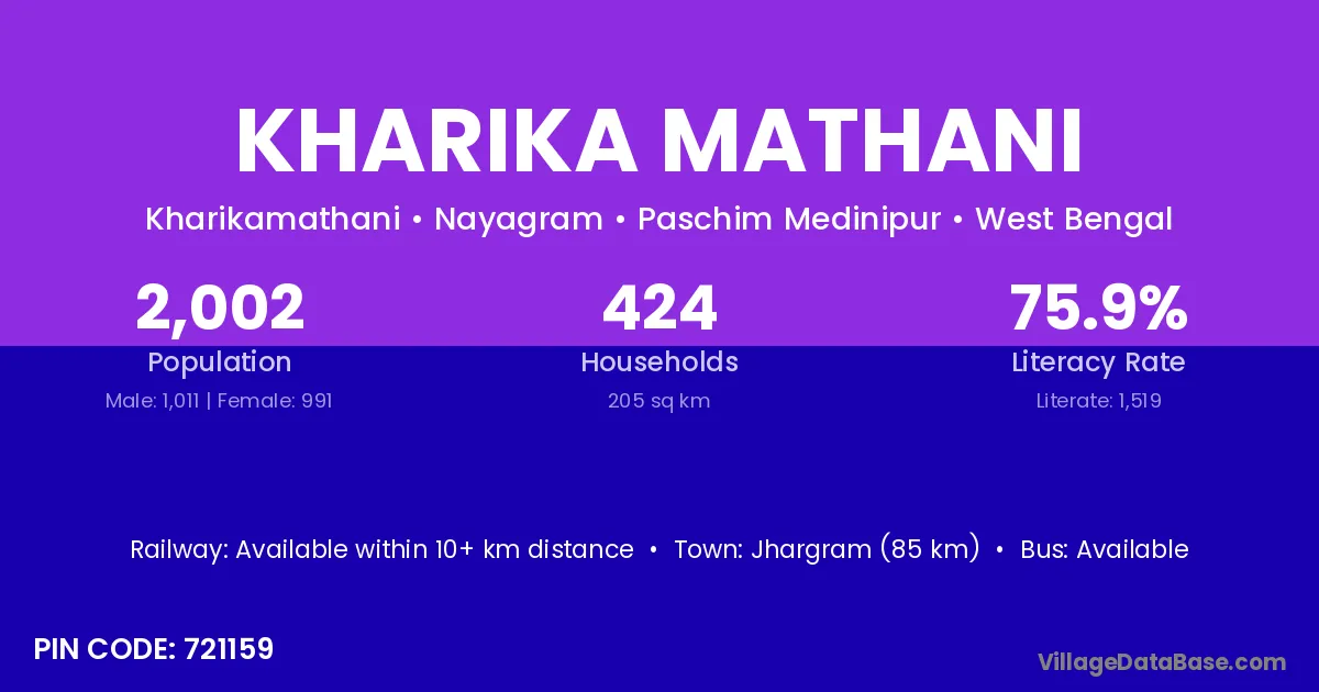 Jhargram (85 km) is the nearest town to Kharika Mathani village for major economic activities and is located approximately 85 km away.