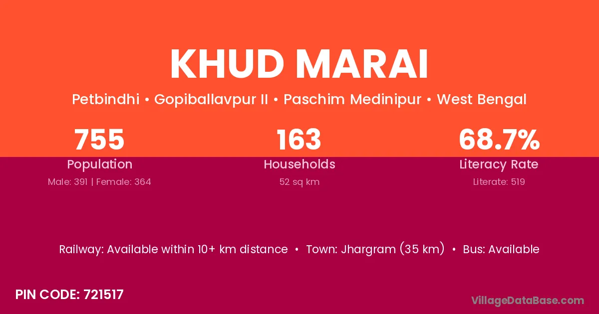 Khud Marai village is located in the Nayagram Subdivision of the Paschim Medinipur district in West Bengal.