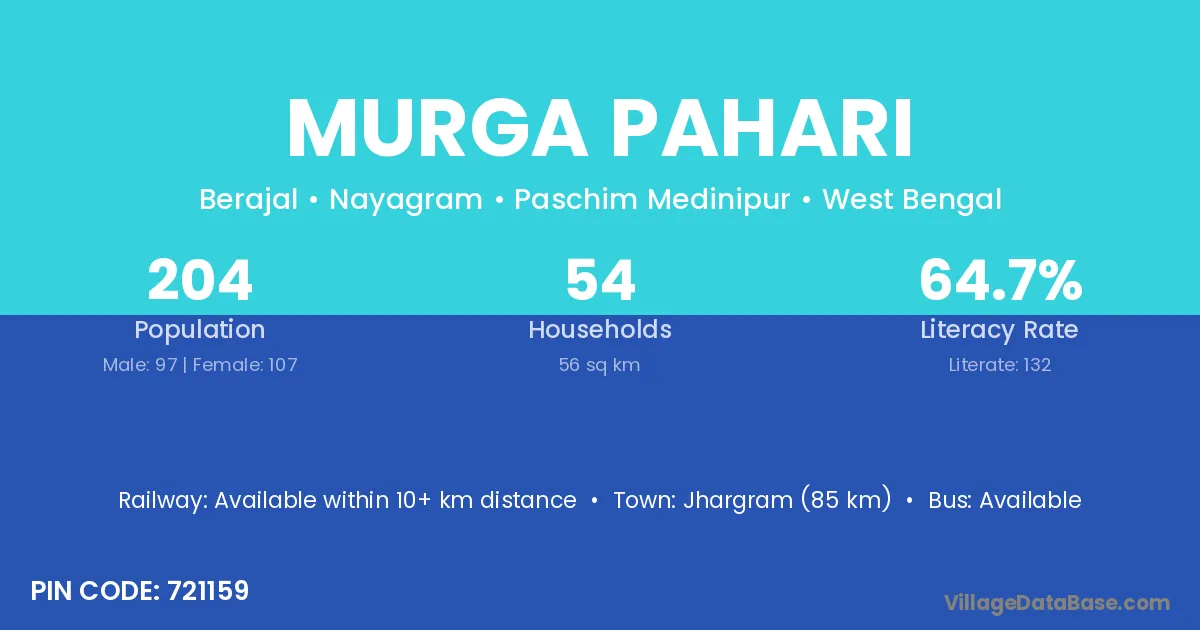 Jhargram (85 km) is the nearest town to Murga Pahari village for major economic activities and is located approximately 85 km away.