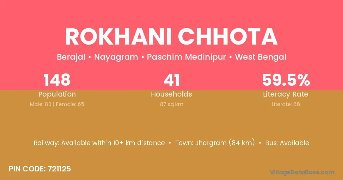 Jhargram (84 km) is the nearest town to Rokhani Chhota village for major economic activities and is located approximately 84 km away.