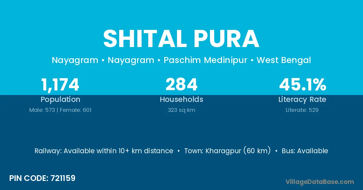 Kharagpur (60 km) is the nearest town to Shital Pura village for major economic activities and is located approximately 60 km away.