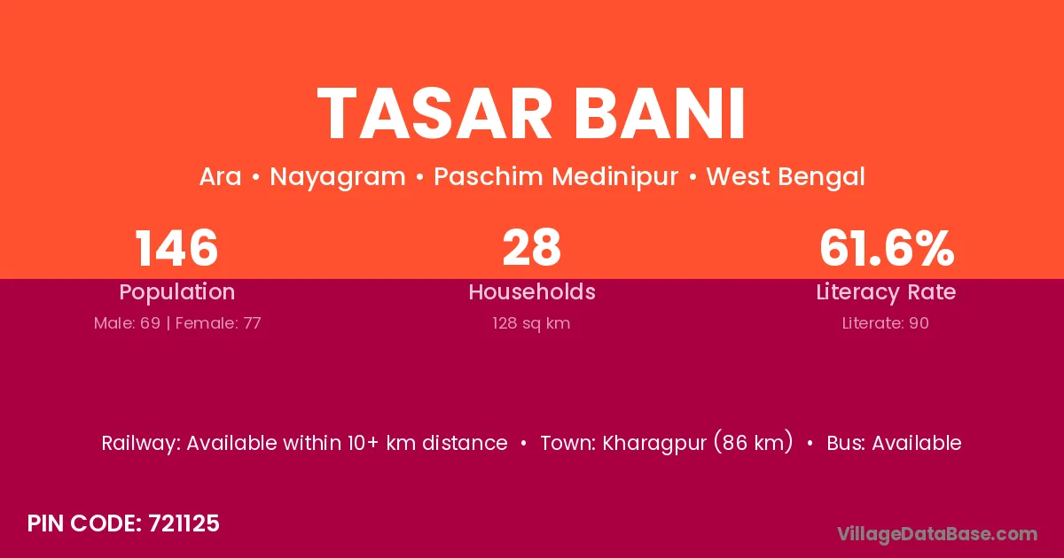 Kharagpur (86 km) is the nearest town to Tasar Bani village for major economic activities and is located approximately 86 km away.