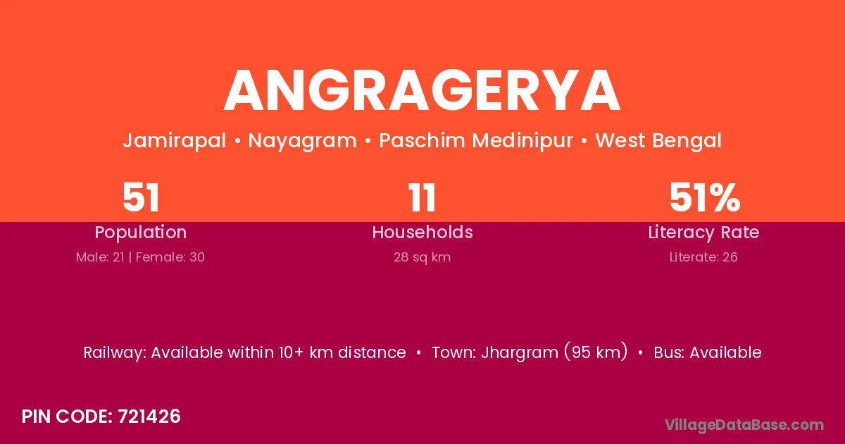 Angragerya village has a total population of 51 people, of which 21 are males and 30 are females.